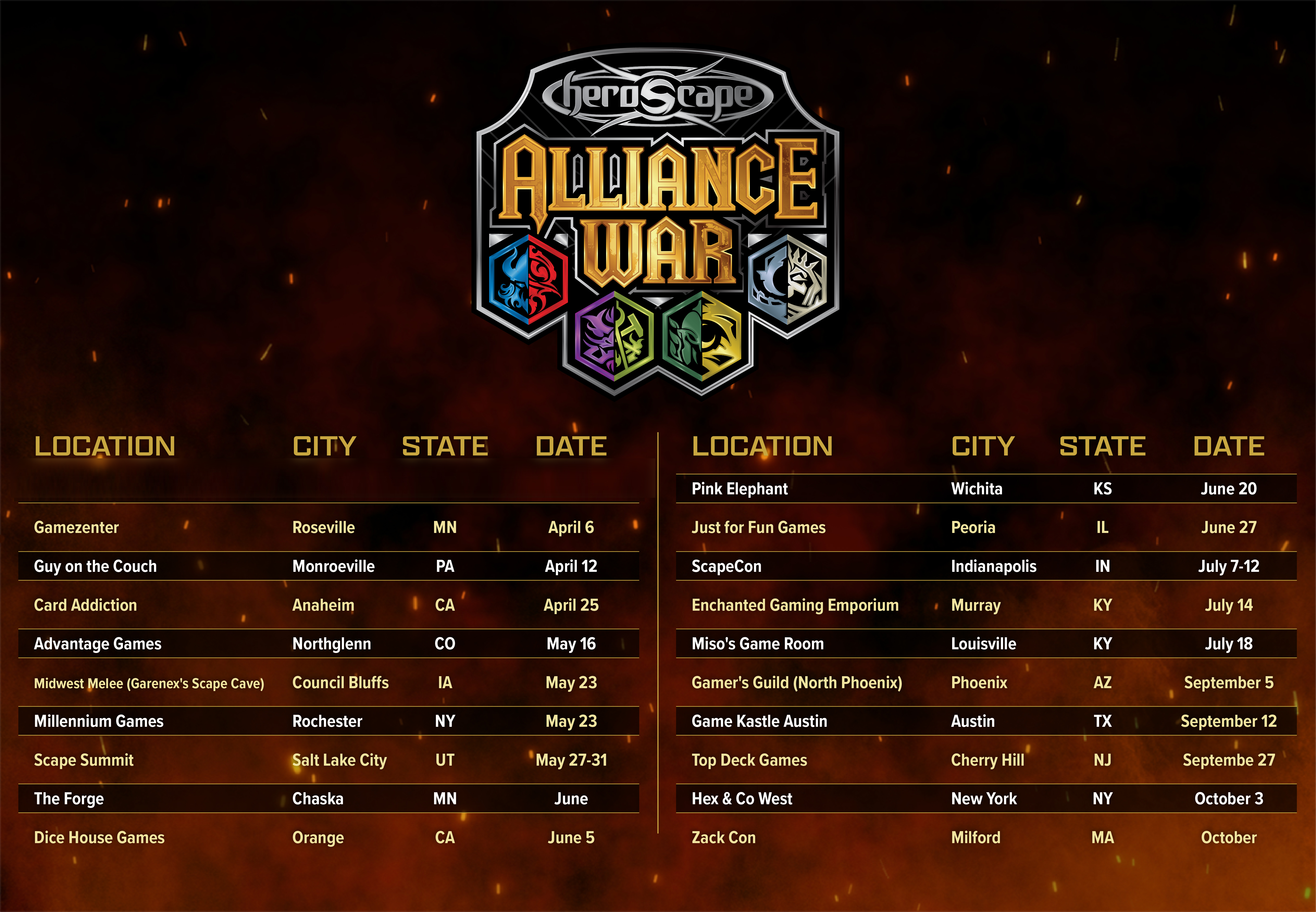 Keep an eye out for Alliance War stops in your area using the calendar below, and keep up-to-date with the latest information by visiting Heroscape.RenegadeGameStudios.com/Local-Play.