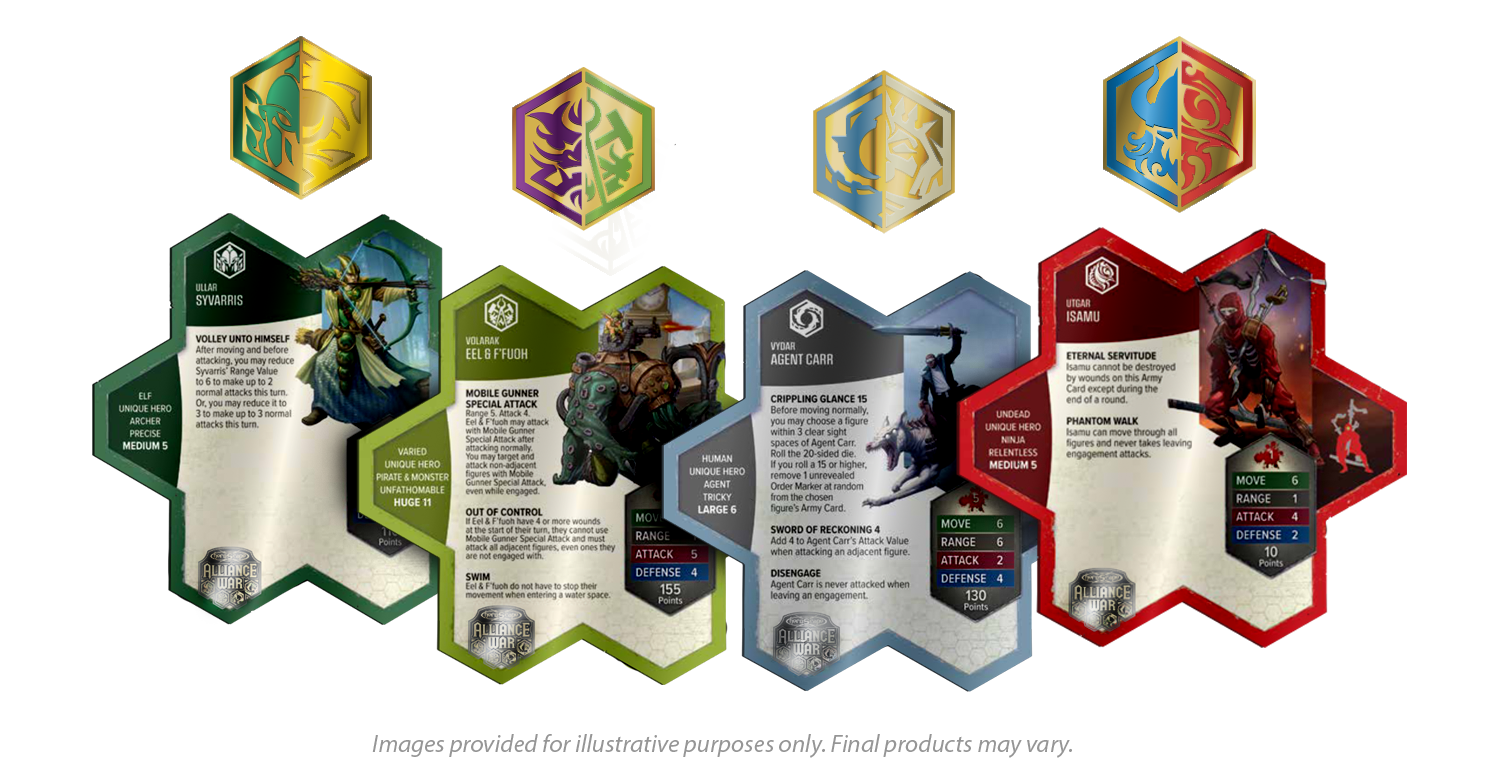 You may find Heroscape's staff playing side by side with you at these tournament events! The winner of any tournament chosen for Alliance War gets the full set of four enamel pins and four plastic Army Cards. They also 'claim' their victory for the faction of their choice: New Alliance, Clockwork Combine, Verdant Pact, or Umbral Covenant.