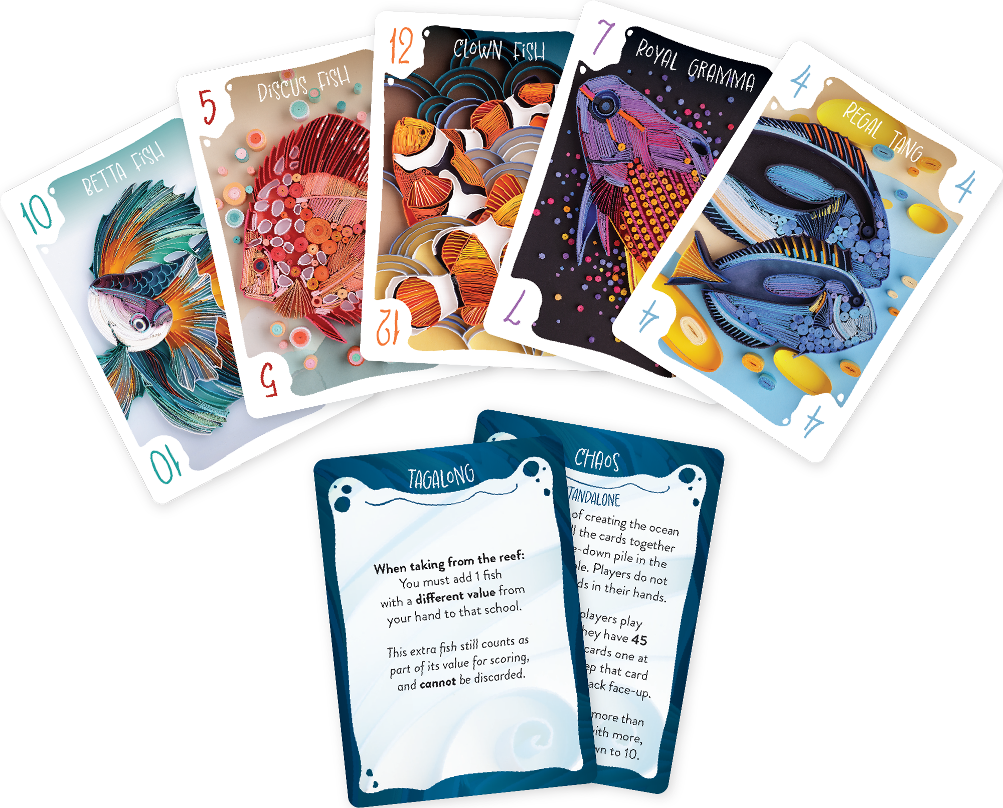 In this quick-playing, deceptively strategic set collection card game, players will guide schools of fish from the Reef, or the central discard area, to their personal